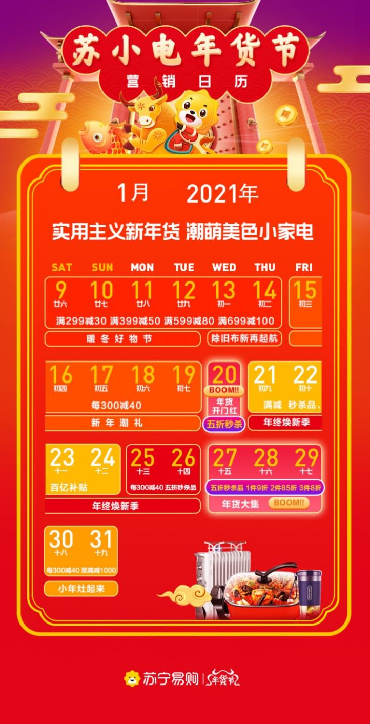 新年脚步临近,置办年货被人们提上日程,苏宁易购2021年货节已正式开启,1月15日,苏宁生活家电正式进入年货节第一波促销期,据苏宁易购消息称,此次年货节将持续到2月19日,也就是正月初八。