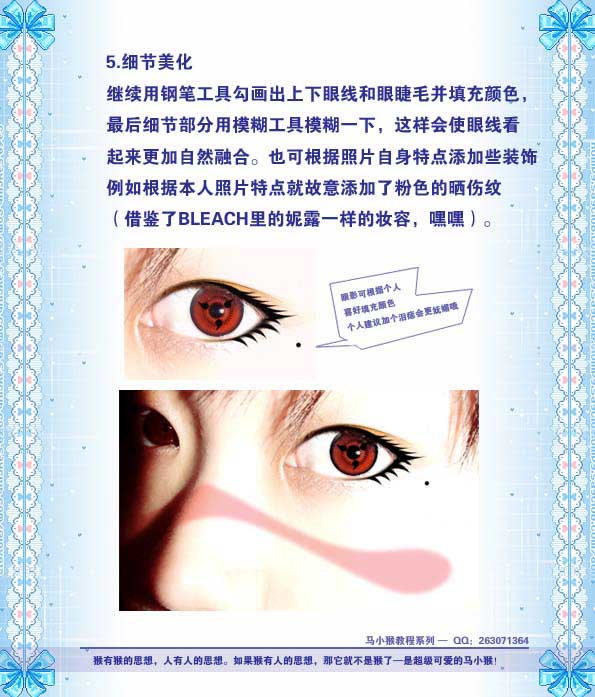 | 5.细节美化继续用钢笔工具勾画出上下眼线和眼睫毛并填充颜色,最后细节部分用模糊工具模糊一下,这样会使眼线看起来更加自然融合。也可根据照片自身特点添加些装饰。 |