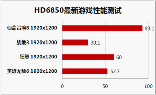 在性能上,HD6850拥有可以满足目前热门游戏流畅运行的需求,在近期主流游戏的测试数据中表明,即便是目前硬件杀手的战地3也绰绰有余,对于只有千元价位的HD6850来讲,这样的性能还是看点十足的。