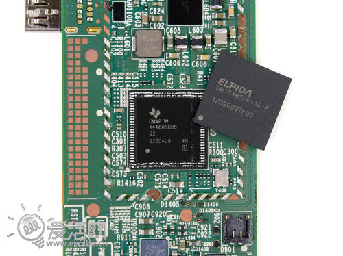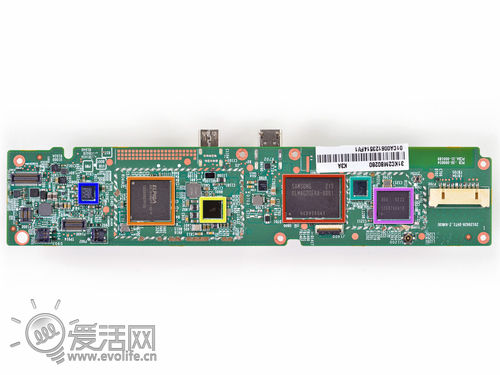 蓝框:欧盛WM8962E超低功耗音频解码器;橙框:尔必达 1GB DDR2内存;黄框:德器TWL6032全集成电源管理芯片;红框:三星eMMC 16GB闪存和闪存控制器;紫框:B50 5222 12507A9A10(查不到资料,功能不详)。
