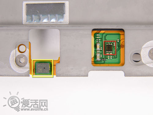 在框架上还有麦克风(黄框)和光线感应器(红框)
