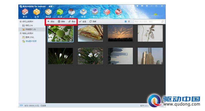 在这里,用户可以使用“添加”和“导出”按钮,手机和电脑之间自由的移动图片文件。通过导出功能,用户还能够方便快捷的将手机中的照片导入到电脑中保存,以便为手机腾出更多的存储空间。