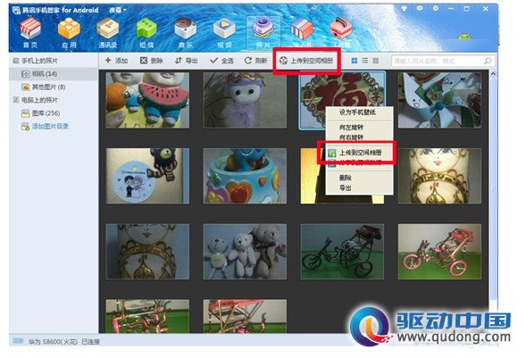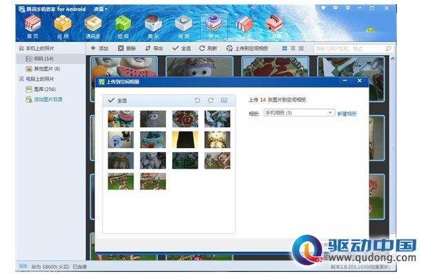 腾讯手机管家PC版帮android智能机用户一键批量上传手机照片到QQ相册功能,快速分享节省手机流量。