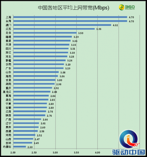 图1:中国各地网民平均上网带宽排名
