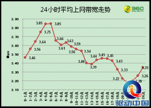 近日,国内最大的网络安全厂商360公司发布的《2013年第一季度中国互联网上网测速报告》(以下简称 《报告》 )显示,中国网民上网平均带宽为3.14Mbps。其中,上海网速最快,高达4.7Mbps,内蒙古2.3Mbps则排名垫底。一天之中上网速度最快的时段是早上4点至6点,而上网速度最慢的时段是晚上20点至21点。在一周之中,星期二的上网速度最快,而星期六的上网速度则最慢。《报告》中还分析了中国运营商发展情况。