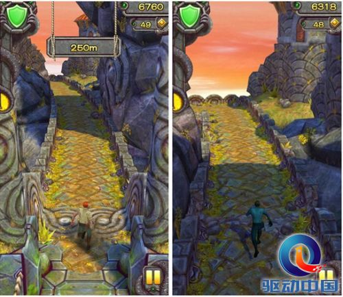先从TempleRun2开始。虽说是个小游戏,但对硬件要求也并不低。在默认中等画质情况下,游戏相当流畅,而设置为最高画质时,流畅度则有所下降。左图为中等画质,右图为高画质