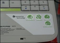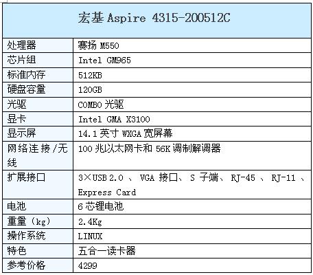 配置上,宏基4315-200512C进行了处理器的升级,由原来的赛扬M530升级为M550,主频也由原来的1.73GHz提升到2.0GHz,搭载GL960芯片组,采用集成Intel GMA X3100显卡,存储空间为512MB内存,120G的高速硬盘,康宝光驱。14.1英寸(1280×800分辨率)宽屏镜面液晶屏,预装LINUX系统。