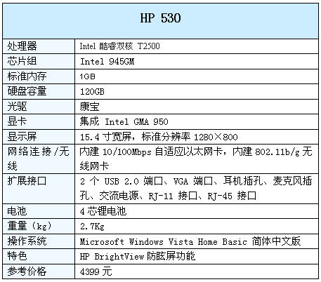 HP530拥有15.4寸的大屏幕,送给爸爸看电影应该很不错,报价仅4399元,这样的价位可以说是HP最便宜的双核笔记本了。