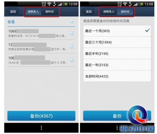 在QQ同步助手Android 4.4中,点开“更多”可以看到短信备份,选择备份到网络,会看到按联系人和按时间,两个备份方式。同样,在使用恢复短信的时候,也会提示按照联系人和按照时间恢复。