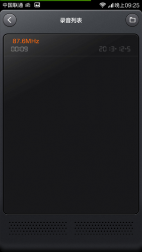 点击菜单的选择频道进入手动选择界面,我们可以自由选择进行调频。同时听到不错的节目是我们还可以给频道录音,录音被保存在录音列表中。录音列表我们可以通过录音机进入,每条录音的名称都是以频道赫兹数命名的。这就是第一个新功能收音机不插耳机就可以收听了。