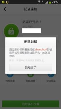 图2:360手机卫士“删除数据”指令可删除丢失手机中的隐私信息
