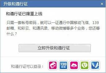飞信、139邮箱等业务的老用户可在登录后,跟从业务的“和通行证”升级引导,点击升级弹窗链接即可一键升级。