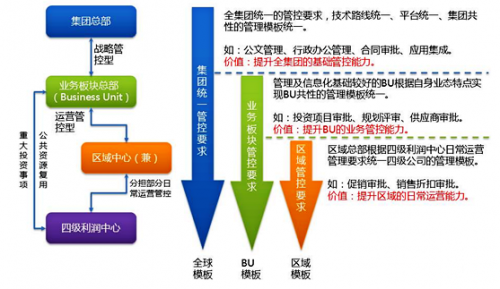杜胜认为,如果忽略以上三种差异,集团企业协同办公系统就会形成“一统就死”的尴尬局面,系统在成员企业中难以得到真正的应用;而如果只考虑差异化,结果可能就会出现“一放就乱”的局面,难以真正实现业务协同,也无法实现资产的复用。