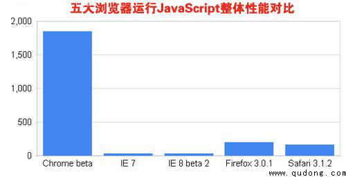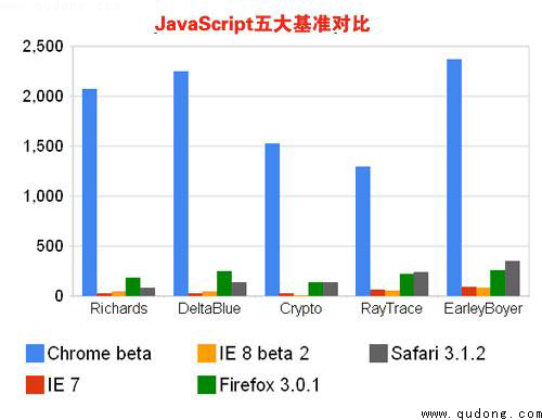 衡量JavaScript处理性能有五大基准,分别为Richards、DeltaBlue、Crypto、RayTrace和EarleyBoyer。经测试显示,在Chrome、IE 8 beta 2、IE 7、Safari 3.1.2和Firefox 3.0.1五款浏览器中,Chrome在五大基准上的表现均优于其他浏览器。