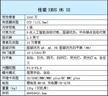 佳能IXUS 85 IS 1000万的有效像素、3倍光学变焦、IS光学防抖、人脸追踪等功能使得该机在性能上也非常强劲,对于日常的拍摄需求还是完全能够满足的。该机三围尺寸为86*54*20.4mm,机身还是比较纤薄的,携带也比较方便。另外它配备2.5英寸液晶屏,显示效果也十分不错。