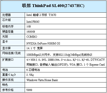 联想ThinkPad SL400(27437HC)采用英特尔酷睿2双核T5670处理器,1GB内存和160GB硬盘。改变大的地方在于该款笔记本采用了NV9系列显卡,这款显卡制程是更加先进的65纳米,因此功耗相对之前80纳米时有一定的降低,同时在高清视频解码方面也有不小的进步。