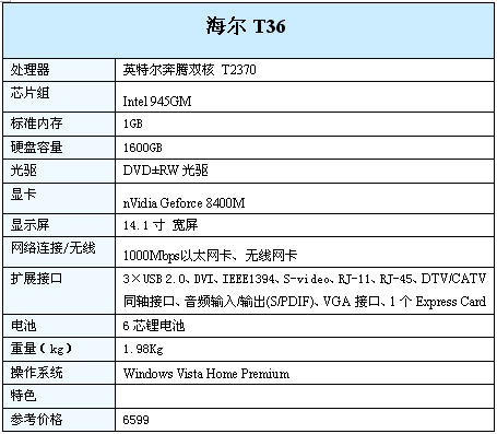 配置方面:海尔 T36配备了英特尔奔腾双核 T2370处理器(最高主频为1.73GHz、二级缓存为1MB、系统前端总线为533MHz)、基于Intel 945GM主板芯片设计、内置1GB DDR2内存、160GB 硬盘、nVidia Geforce 8400M独立显卡、内置DVD±RW光驱,10/100M网卡,无线网卡,预装Windows Vista Home Premium操作系统。