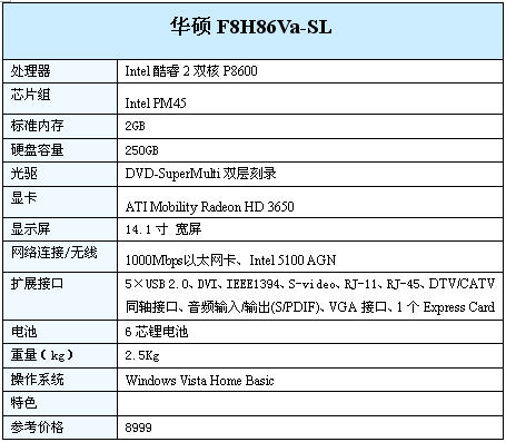 配置上,华硕F8H86Va-SL笔记本采用酷睿2双核P8600处理器,英特尔PM45主板芯片组,英特尔5100AGN无线网卡,蓝牙模块;拥有250GB硬盘、2GB内存、内置DVD SuperMulti光驱;ATI HD3650独立显卡;预装Vista Home Basic操作系统。(华硕各机型型号含义请见:华硕笔记本型号大拆解 看型号识配置 )