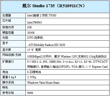戴尔Studio系列是戴尔推出的家庭与家庭办公笔记本,其中顶配版的戴尔Studio 1735(R510911CN)笔记本已经将CPU升级到了酷睿2双核T9300处理器、320GB硬盘。目前在戴尔官网订购这款机器,还能免费获得15个月的麦咖啡防毒软件,订购价格为9999元。对这款产品感兴趣的朋友可以拨打戴尔免费咨询电话:800-858-2339,网上订购优惠。