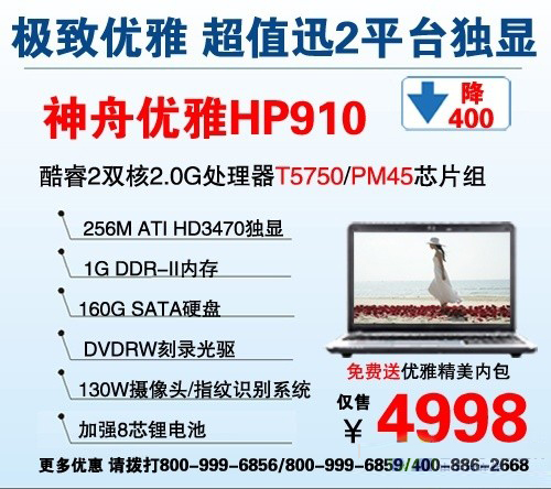 配置方面,该款优雅HP910搭配了英特尔T5750处理器,英特尔PM45主板芯片组,英特尔5100agn无线网卡。另外还配备了HD3470独立显卡,1GB DDR2内存,160GB SATA硬盘,DVD刻录机。