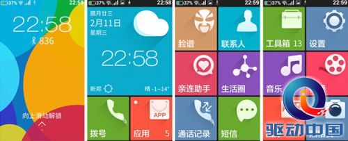 第一页:天气、时间、日历、拨号、应用。点击日历和天气,可以分别进入老黄历和天气界面,天气预报既可以查看当天的天气情况,也可以查看一周的天气情况。点击应用界面左上角的图标,进入应用商店,里面有大量软件可以下载。