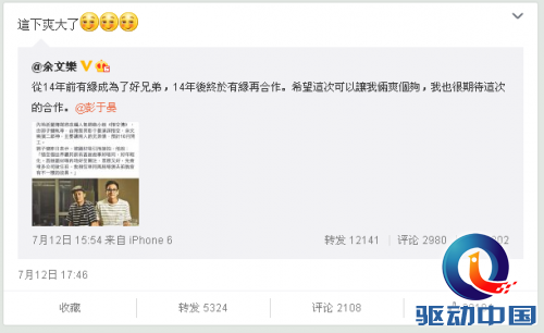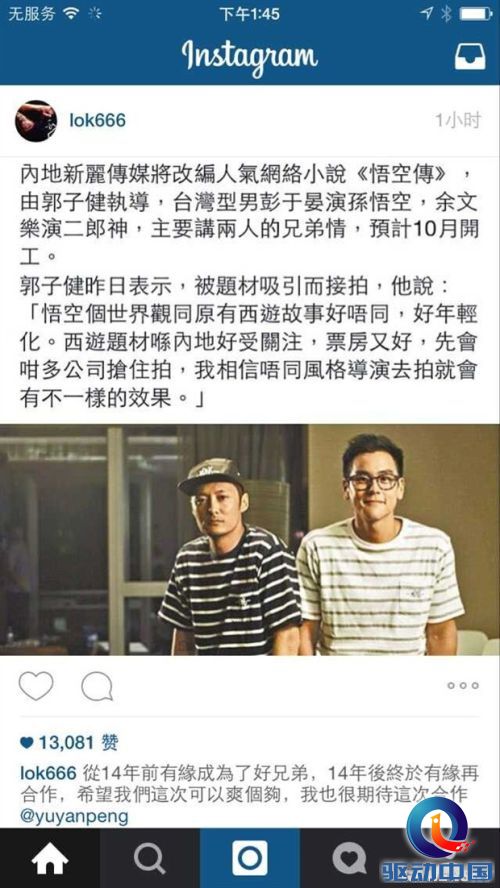 昨日,余文乐在ins上发文称将与台湾型男彭于晏合作,出演由网络小说《悟空传》改编的大电影。据悉影片将由郭子健执导,彭于晏演饰演孙悟空,余文乐出演二郎神。影片将主要聚焦于主要讲两人的兄弟情,预计今年10月开工。这也是彭于晏余文乐二人自2002年在电视剧《爱情白皮书》里之后的首度合作。