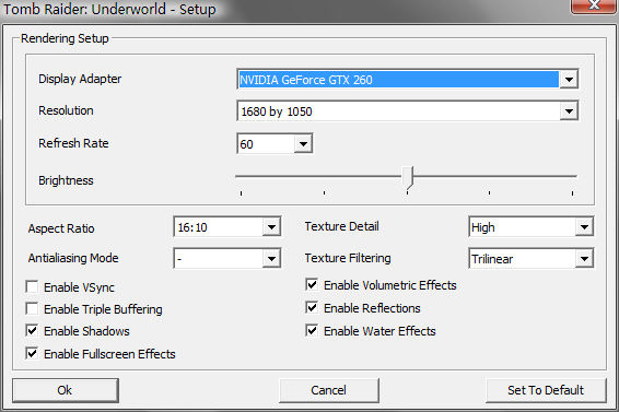 经过短暂的测试我们发现《古墓丽影:地下世界》的要求真不是说笑的,2年前的高端和当今的低端产品纷纷倒下。主要是因为如果不能特效全开的话,你不但错过了美伦美焕的自然环境和古墓,有时还甚至大大拖延了游戏的通关进度。但要特效全开的话,笔者估计起码需要一款Geforce9600GSO或相同级别的显卡。