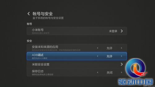 2、打开“小米盒子设置”→“账号安全”,将“安装未知来源的应用”和“ADB调试”设置为允许。