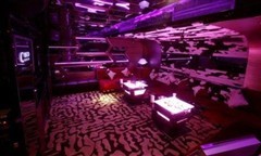 一系列巨大,不规则蓝色相框组成通道两侧摆放着巨型的蓝色艺术雕塑。相框的边缘射出蓝色灯光,营造出动感撩人的效果。而通道内蓝色的镭射灯则带来超幻视觉感受。