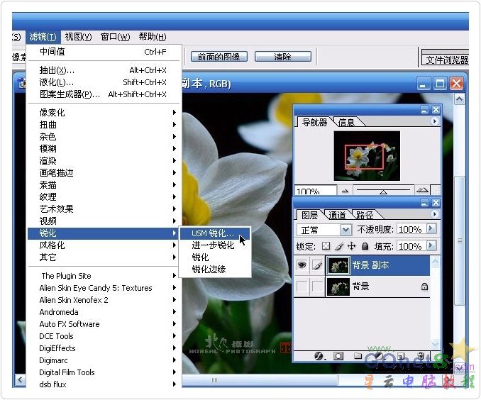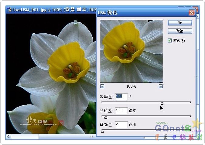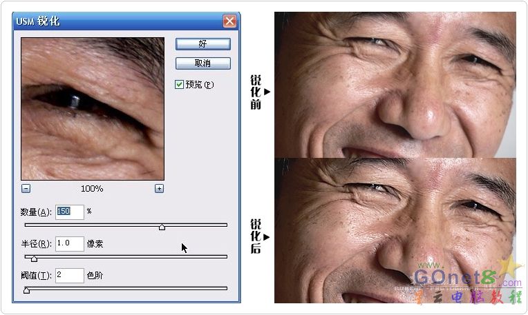 USM,啥意思?我也说不太清,反正它是PS滤镜里带的一种锐化法,你就记住肯定比小软件锐的精就行了。