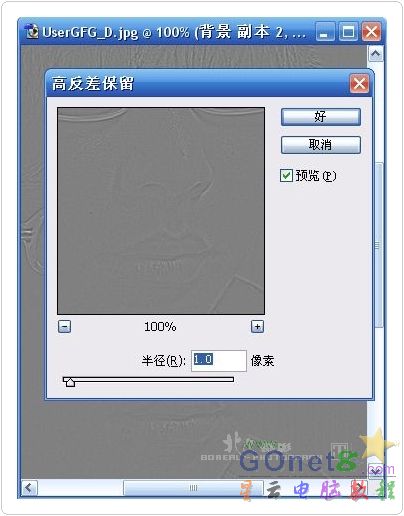 第五步,调“半径”,俺觉得在1-4为佳,根据你图片大小和需锐的程度,自己拿主意吧。