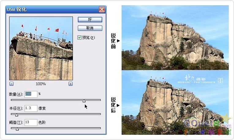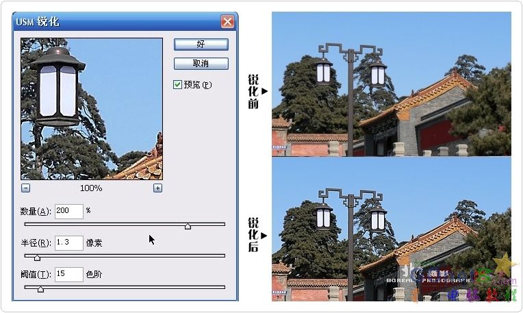 锐化参数:各值只作参考,图的大小决定参数的大小。俺示例用图为1024×768像素。