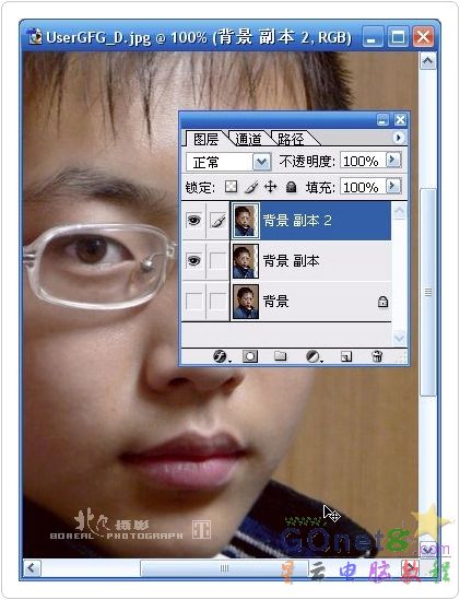 第二步,复制二层,把原图层眼睛关上,选中最上图层,把图放大到100%。