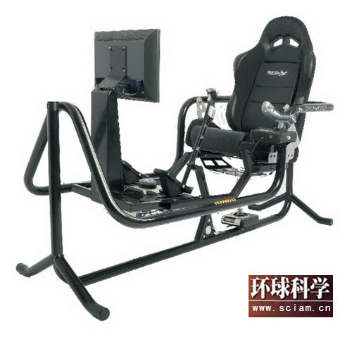 这是一款虚拟现实飞行仿真转台,宽三英尺( 0.9米),长6英尺( 1.8米),铝制框架和其座位为黑色粉末涂层,座位前有三个视频可监控飞行图像。该产品可通过座位和控制杆操控飞行并将其反馈到屏幕上。售价为10500美元。