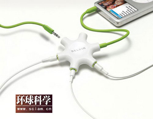 Rockstar集线器可以在同一个MP3播放器上连接5组耳机。几个人就可以一起收听,而无须电感性电位分压器。售价:20美元。