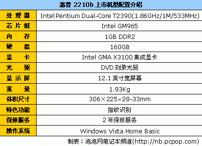 惠普Compaq 2210b(FJ129PA)采用12.1英寸WXGA宽屏幕设计,配备了Intel Pentium Dual-Core T2390双核处理器(1.86GHz主频/1MB二级缓存/533MHz前端总线)、Intel GM965芯片组、1GB DDR2内存、160GB硬盘、DVD刻录光驱和Intel GMA X3100集成显卡。目前,它的经销商报价为6970元。