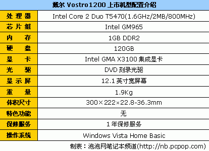戴尔Vostro1200采用12.1英寸WXGA宽屏幕设计,配备了Intel Core 2 Duo T5470“酷睿2代”处理器(1.6GHz主频/2MB二级缓存/800MHz前端总线)、Intel GM965芯片组、1GB DDR2内存、120GB硬盘和DVD刻录光驱。目前,它的经销商报价为5152元。