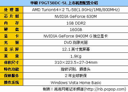 华硕F9GT58DC-SL采用12.1英寸WXGA宽屏幕设计,配备了AMD Turion64×2 TL-58双核处理器(1.9GHz主频/1MB二级缓存/800MHz前端总线)、NVIDIA GeForce 630M芯片组、1GB DDR2内存、160GB硬盘、DVD刻录光驱、NVIDIA GeForce 8400M G独立显卡。目前,它的经销商报价为5472元。