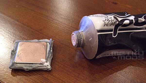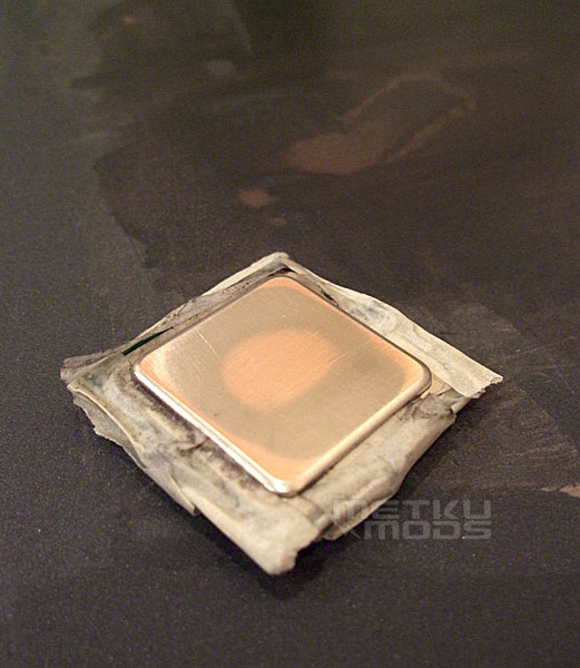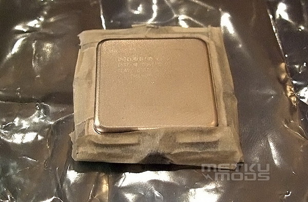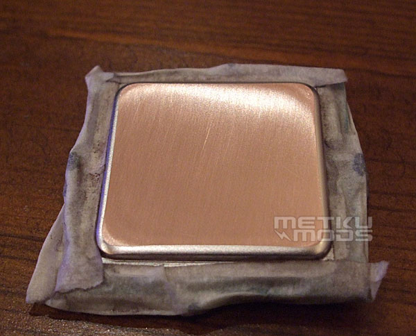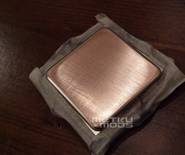 这是使用1200细腻的水砂纸打磨之后的样子,处理器的顶盖表面变得非常平滑。如果你不是想要弄出一个镜面处理器来的话,那么可以省点功夫,使用800规格的水砂纸足够达到较好的效果。不过老衲这次是要弄出镜子般平滑的处理器,由此,我们要继续下去……