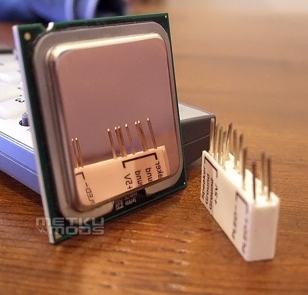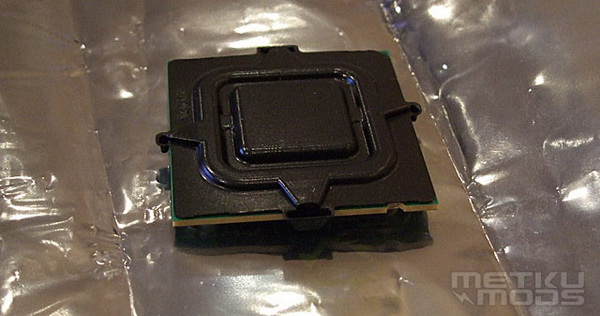 在真正开始打磨处理器之前,我们要给处理器作一些防护措施。首先给处理器的金属触点,罩上专用的黑色保护壳。这个东西很好找,找个贩卖处理器的柜台要一个就ok了。为了保护处理器的PCB基板,还要在周围粘贴一层胶带。