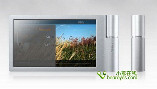 刚刚揭晓的08年G-Mark大奖SPINN一款产品斩获两个殊荣,其中就包括吸取了布劳恩收音机灵感的GUI界面设计。拿主控制界面来讲,正中是一根白色指针,用户可以通过滚轮控制指针背后的功能按钮左右滑动,待到相应功能上时即会显示为橙色,醒目易辨识。值得一提的是,SPINN跟Clix一样采用AMOLED屏幕,尺寸达到超大的3.3英寸,其鲜艳的颜色、清晰的成像以及近乎180度的可视角度非常完美,和Clix相比,分辨率也从320×240 QVGA提升到480×272 WQVGA分辨率,SPINN的妖娆一目了然。