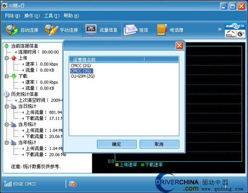 在软件界面的左下角显示目前所处环境和以备连接的网络信息,其中包含了网络的频段和信号强度,由于软件上显示的为EDGE,那么也就是我们目前软件所处为2G状态,所以为了体验3G的快感我们选择手动连接。