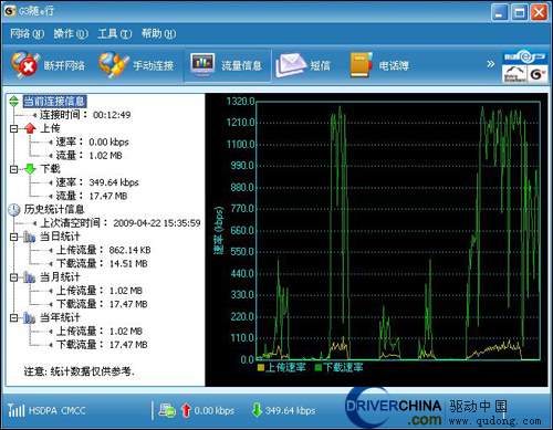 然后我们回到G3随e行软件的流量管理当中来,我们发现在软件中所描绘的流量曲线中,最高下载峰值达到1.3Mbps左右。鉴于对G3随e行所表现出的惊人状态,我们使用迅雷对其进行了下载测试。测试结果反映,以5线程的下载方式通过被测网站电信服务器下载9MB左右大小的软件,最高速度达130KB/S,平均120KB/S,总耗时为1分13秒,可见中国移动TD-SCDMA的速度的确名不虚传,其相对速度已经达到了固网1MB左右的带宽。