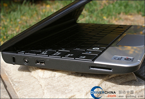 左边从上至下分别为:安全锁具孔、DC-IN电源适配器输入接口、USB接口以及多功能读卡器槽位,其中DC-IN接口位于左侧还是非常明智的设计,因为许多管用右手的朋友们在使用USB设备、鼠标以及网线接口时会出现线路冗杂的现象,看来一点点细节方面在大的厂商眼中还是必须要考虑到的。