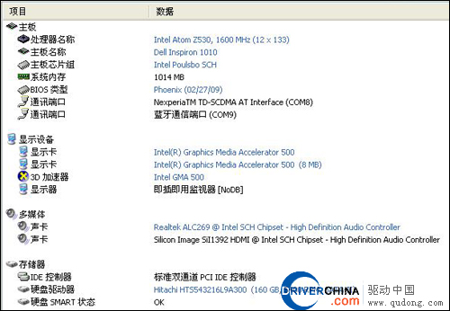 首先是来看Insprion mini10的处理器信息。其实我们平时所经常购买到的上网本所采用的处理器是Intel Atom N270处理器,在规格上,其与DELL mini10所采用的Z530处理器频率等等参数完全一致,所不同的是,Z530较之以往的N270处理器系统能够更好的支持H.264 、MPEG 2 、MPEG 4 、VC1及WMV9的Clear Video解码技术,以及完全支持对高清视频的硬件解码加速。并且,全新的Z530处理器拥有更低的功耗,所以普通的散热片可以非常轻松的应付。