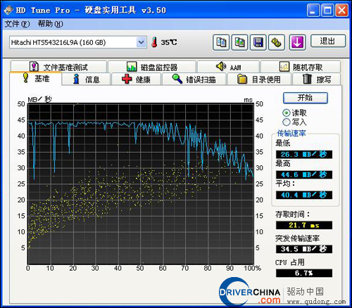 根据信息所显示,Insprion mini10采用了日立160GB 5400转2.5英寸硬盘,我们通过HD Tune对其进行了测试,测试结果显示成绩并不十分理想,但是处理器占用以及温度方面表现较为突出。其实,日立2.5英寸硬盘拥有诸多优点,其中包括著名的磁头载入载出技术,其可以保证在断电后磁头停在盘片的外侧不会因外力造成盘片的损伤,所在数据安全方面具有非常高的保障。