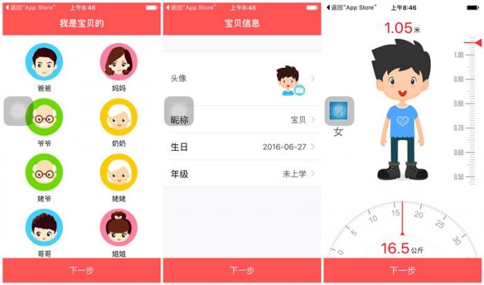 从上文可以看到360巴迪龙5S在功能性方面是远超以往的儿童手表产品的,但是家长手机端的APP依旧具备了强大的功能,接下来就为大家简要介绍一番吧。第一次使用手机端的时候,需要进行一些简单的设置,比如手机端的用户称呼、孩子个人信息以及身高等内容。