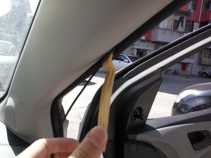 随后将线藏入副驾驶车门密封条内。360团队看样是真心为用户考虑,很贴心附赠小工具一枚。利用小撬棍就可以轻松打开车门密封条。