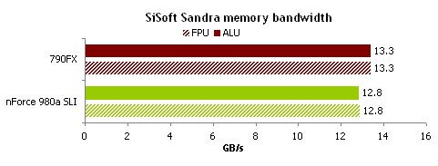 这里nForce 980a SLI在延时测试中表现更出色,不过790FX则拥有更高的带宽。