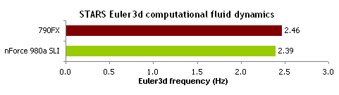 STARS Euler3D看起来更青睐于更高的带宽而不是低内存延迟,这里790FX超过了nForce 980a SLI。